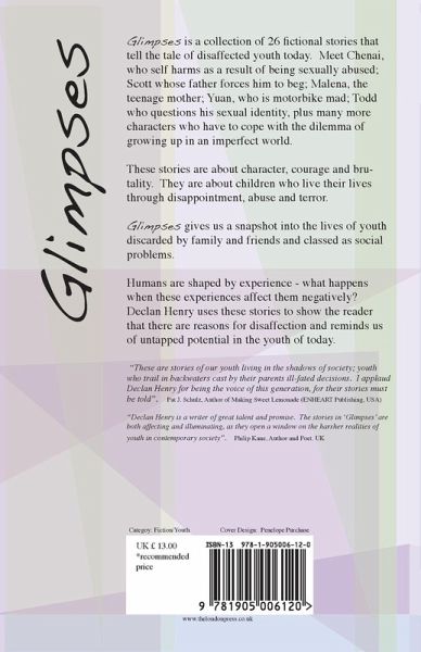 Three out of every four children enjoy a good enough childhood, and manage to successfully navigate the transition from adolescence to adulthood-emerging as sane and well-adjusted human beings. However, the remaining one in four of our children are ill treated, abused, brutalised and abandoned through circumstances beyond their control. The 26 short stories contained in Glimpses are all based on fictional characters and scenarios, but nevertheless, the kind of circumstances displayed in the stories are true to life. Glimpses gives us a snapshot into the lives of youth discarded by family and friends and classed as social problems. Teenagers are shaped by experience - what happens when these experiences affect them negatively? Declan Henry uses these stories to show the reader that there are reasons for problematic behaviour and reminds us of untapped potential in the youth of today.