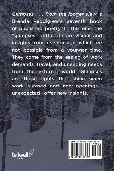 Glimpses . . . from the longer view is Brenda Peddigrew's seventh book of published poetry. In this one, the "glimpses" of the title are visions and insights from a senior age, which are not possible from a younger time. They come from the easing of work demands, travel, and unending needs from the external world. Glimpses are those lights that shine when work is eased, and inner openings-unexpected-offer new insights.