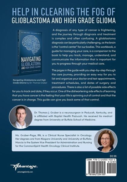 A diagnosis of any type of cancer is frightening, and the journey through diagnosis and treatment is complex and often confusing. A Glioblastoma diagnosis can be particularly challenging, as the brain is the "control center" for our bodies. This workbook, a guide for managing your care, is a companion to the book to help you track, manage, understand, and communicate the information that is important for you to progress through your medical care.