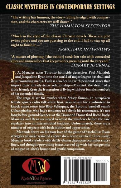 "A master of plotting." Library Journal. It's Toronto in July. There's an out-of control baseball player. A frenzied sports media. A talk-show host who enjoys playing devil's advocate. The field is ready-for murder. "A finely drawn police procedural written in the style of Georgette Heyer, long considered queen of the British mystery genre... appealing characters, creative plot and classic Agatha Christie style writing." The Suspense Zone The second in a classic police procedural series of traditional whodunits set in contemporary Toronto. Homicide detective Inspector Paul Manziuk is mourning the death of his best friend. Constable Jacqueline Ryan is trying to get her bearings and figure out how to keep from irritating an already-stressed Manziuk without losing her self-respect. But not far from Toronto police headquarters, two people are speaking words that will lead to murder. Rico Velasquez, the Toronto Matrix's new Cuban pitcher, is determined to prove he deserves the huge contract he's been given. So he explodes in anger and derision when a reliever gives up a home run that takes away his win. A day later, Stasey Simon, a radio talk-show host who thrives on controversy, asks on-air for a volunteer to knock some sense into Rico. Before long, groundskeepers at the Diamond Dome find Rico's body in the bullpen, and Manziuk and Ryan are given the task of arresting the murderer before the case escalates into an international incident. Of course, Stasey herself is a prime suspect. So are several other members of the sports media, an obsessed fan, Rico's neglected wife, the pitcher Rico embarrassed, the elusive owners of the baseball team, and a Marilyn Monroe wannabe who seemed to think Rico was her Joe DiMaggio. Manziuk draws on his own love of the game of baseball while Ryan struggles to make sense of a sport she's never watched.