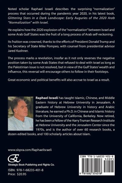 Noted scholar Raphael Israeli describes the surprising "normalization" process that occurred during the pandemic year 2020, in his latest book, Glittering Stars in a Dark Landscape: Early Auguries of the 2020 Arab "Normalization" with Israel. He explains how the 2020 explosion of the "normalization" between Israel and some Arab Gulf States was the fruit of a long process of Arab self-reckoning. Its fruition was crowned, thanks to the efforts of President Donald Trump and his Secretary of State Mike Pompeo, with counsel from presidential advisor Jared Kushner. The process marks a revolution, insofar as it not only reverses the negative position taken by some Arab States that refused to deal with Israel as long as the Palestinian issue is not resolved, but in view of the Gulf States' wealth and influence, this reversal will encourage others to follow in their footsteps. Great economic and political benefits will also accrue to Israel as a result. (About the Author) Raphael Israeli has taught Islamic, Chinese, and Middle Eastern history at Hebrew University in Jerusalem. A graduate of Hebrew University in history and Arabic literature, he earned a Ph.D. in Chinese and Islamic history from the University of California, Berkeley. Now retired, he has been a Fellow of the Harry Truman Research Institute at Hebrew University and the Jerusalem Center since the 1970s, and is the author of over 60 research books, a dozen edited books, and 100 scholarly articles about Islam.