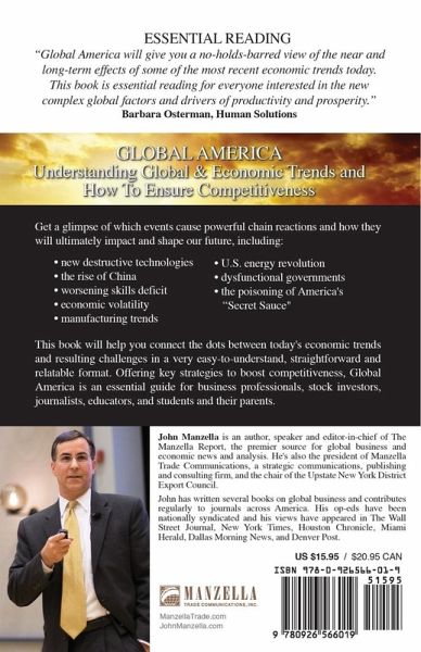 John Manzella, recognized author, speaker and global business consultant, shares his inside perspective on the complex challenges that face America in the domestic and global arena. Get a glimpse of which events cause powerful chain reactions and how they will ultimately impact and shape our future, including new destructive technologies, the rise of China, worsening skills deficit, economic volatility, manufacturing trends, U.S. energy revolution, dysfunctional governments, and the poisoning of America's "Secret Sauce." This book will help you connect the dots between today's economic trends and resulting challenges in a very easy-to-understand, straightforward and relatable format. Offering key strategies to boost competitiveness, Global America is an essential guide for business professionals, stock investors, journalists, educators, and students and their parents.