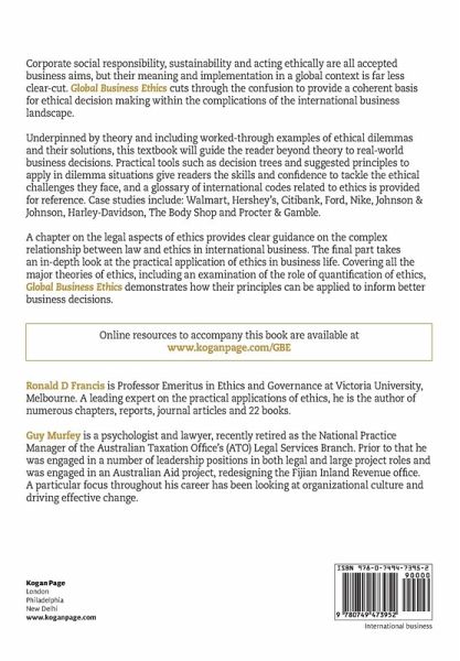 Taking a fresh look at one of the key foundations of business--the need to conduct business responsibly, sustainably, and within a sound ethical framework--"Global Business Ethics "is a guide for ethical decision making within the international business landscape. Enriched with worked examples of ethical dilemmas and their solutions, this book goes beyond theory to real-world business decisions.It includes a chapter focused solely on legal ethics and discusses ethical gradualism and quantification of ethics.The final chapters take an in-depth look at the practical application of ethics in business life and advice on avoiding and solving ethical problems an organization may face.