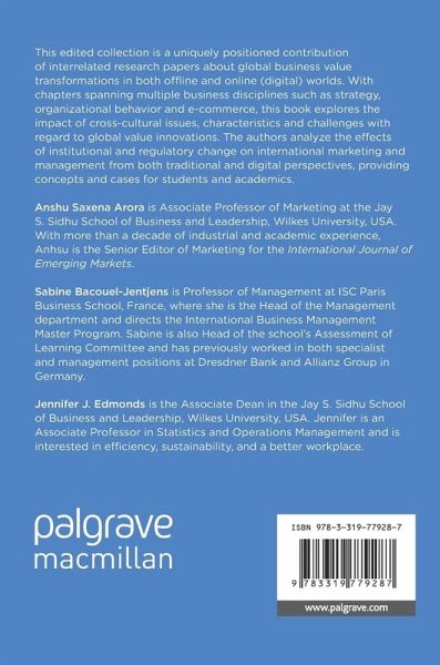 This edited collection is a uniquely positioned contribution of interrelated research papers about global business value transformations in both offline and online (digital) worlds. With chapters spanning multiple business disciplines such as strategy, organizational behavior and e-commerce, this book explores the impact of cross-cultural issues, characteristics and challenges with regard to global value innovations. The authors analyze the effects of institutional and regulatory change on international marketing and management from both traditional and digital perspectives, providing concepts and cases for students and academics.