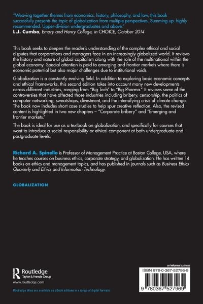 Globalization is a constantly evolving field. In addition to exploring basic economic concepts and ethical frameworks, this second edition takes into account many new developments across different industries, ranging from "Big Tech" to "Big Pharma." It reviews some of the controversies that have affected those industries including bribery, censorship, the politics of computer networking, sweatshops, divestment, and the intensifying crisis of climate change. The book now includes short case studies to help spur creative reflection. Also, the revised content is highlighted in two new chapters - "Bribery and Corruption" and "Emerging and Frontier Markets."