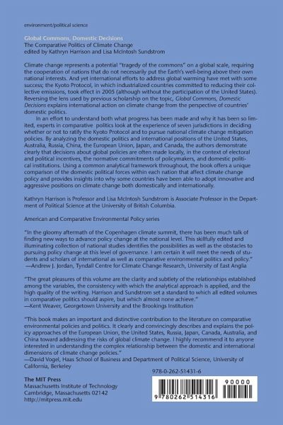 Comparative case studies and analyses of the influence of domestic politics on countries' climate change policies and Kyoto ratification decisions. Climate change represents a "tragedy of the commons” on a global scale, requiring the cooperation of nations that do not necessarily put the Earth's well-being above their own national interests. And yet international efforts to address global warming have met with some success; the Kyoto Protocol, in which industrialized countries committed to reducing their collective emissions, took effect in 2005 (although without the participation of the United States). Reversing the lens used by previous scholarship on the topic, Global Commons, Domestic Decisions explains international action on climate change from the perspective of countries' domestic politics. In an effort to understand both what progress has been made and why it has been so limited, experts in comparative politics look at the experience of seven jurisdictions in deciding whether or not to ratify the Kyoto Protocol and to pursue national climate change mitigation policies. By analyzing the domestic politics and international positions of the United States, Australia, Russia, China, the European Union, Japan, and Canada, the authors demonstrate clearly that decisions about global policies are often made locally, in the context of electoral and political incentives, the normative commitments of policymakers, and domestic political institutions. Using a common analytical framework throughout, the book offers a unique comparison of the domestic political forces within each nation that affect climate change policy and provides insights into why some countries have been able to adopt innovative and aggressive positions on climate change both domestically and internationally.