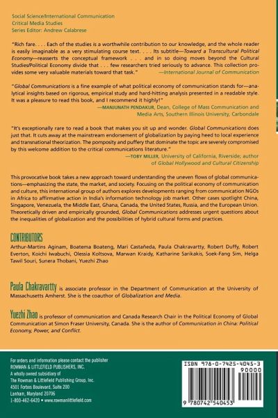 Introduction Part I: The State and Communication Politics in Multiple Modernities Chapter 1: Neoliberal Strategies, Socialist Legacies: Communication and State Transformation in China Chapter 2: Media, State, and Responses to Globalization: The Case of Post-Communist Russia Chapter 3: Regional Crisis, Personal Solutions: The Media's Role in Securing Neoliberal Hegemony in Singapore Chapter 4: Governance and Legitimacy: The Case of the European Union Chapter 5: Media, Democracy, and the State in Venezuela's "Bolivarian Revolution" Part II: Embedded Markets and Cultural Transformations Chapter 6: Cultures of Empire: Transnational Media Flows and Cultural (Dis)Connections in East Asia Chapter 7: Local and Global Sites of Power in the Circulation of Ghanaian Adinkra Chapter 8: A Transcultural Political Economy of the Arab Television Industry Chapter 9: Rethinking the Spanish-language Media Market in the U.S. Part III: Civil Society and Multiple Publics Chapter 10: Gender and Empire: Performing Femininities in the War on Terrorism Chapter 11: Neoliberalism, Nongovernmental Organizations, and Communication in Sub-Saharan Africa Chapter 12: Move Over Bangalore, Here Comes . . . Palestine? Western Funding and "Internet Development" in the Shrinking Palestinian State Chapter 13: Labor in or as Civil Society? Workers and Subaltern Publics in India's Information Economy References