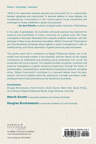 Introduction, Henrik Enroth & Douglas Brommesson / 1. Global?, Gayatri Chakravorty Spivak / 2. Narratives of Global Political Space: Globalisation Theory or Historical Sociology and Civilizational Analysis, Martin Hall / 3. Medieval World Society Meets R2P: Moral and Legal Personality in Thomas Aquinas, Douglas Brommesson / 4. Global Community as a Response to the Cosmopolitan Solidarity Problem, Luke Ulas / 5. Creating a Collaborative Community: Problems and Possibilities of Collaborative Autobiographical Writing in Jonathan Morgan's Finding Mr Madini, Jenny Siméus / 6. Community in Fragments: Reading Relation in Fragments of Heraclitus, Carrie Giunta / 7. Virtual Religious Communities - Old Wine in New Wineskins?, Jørgen Straarup / 8. The "Spirit of Internationalism" in the Pre-War Women's Movement, Susan Hinely / 9. Community?, Henrik Enroth