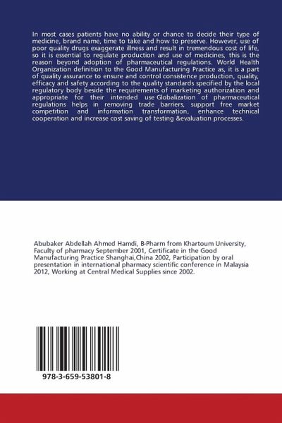 In most cases patients have no ability or chance to decide their type of medicine, brand name, time to take and how to preserve. However, use of poor quality drugs exaggerate illness and result in tremendous cost of life, so it is essential to regulate production and use of medicines, this is the reason beyond adoption of pharmaceutical regulations. World Health Organization definition to the Good Manufacturing Practice as, it is a part of quality assurance to ensure and control consistence production, quality, efficacy and safety according to the quality standards specified by the local regulatory body beside the requirements of marketing authorization and appropriate for their intended use Globalization of pharmaceutical regulations helps in removing trade barriers, support free market competition and information transformation, enhance technical cooperation and increase cost saving of testing &evaluation processes.