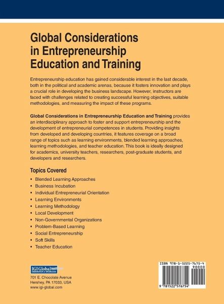 Entrepreneurship education has gained considerable interest in the last decade, both in the political and academic arenas, because it fosters innovation and plays a crucial role in developing the business landscape. However, instructors are faced with challenges related to creating successful learning objectives, suitable methodologies, and measuring the impact of these programs. Global Considerations in Entrepreneurship Education and Training provides an interdisciplinary approach to foster and support entrepreneurship and the development of entrepreneurial competences in students. Providing insights from developed and developing countries, it features coverage on a broad range of topics such as learning environments, blended learning approaches, learning methodologies, and teacher education. This book is ideally designed for academics, university teachers, researchers, post-graduate students, and developers and researchers.