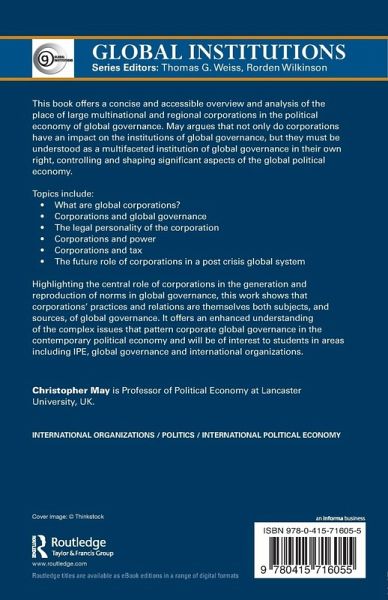 This book offers a concise and accessible overview and analysis of the place of large multinational and regional corporations in the political economy of global governance.May argues that not only do corporations have an impact on the institutions of global governance, but they must be understood as a multifaceted institution of global governance in their own right, controlling and shaping significant aspects of the global political economy.