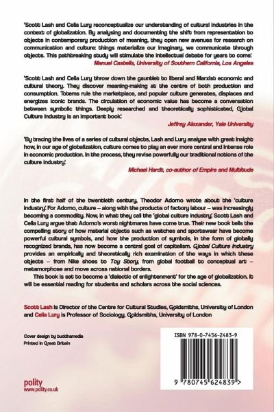 In the first half of the twentieth century, Theodor Adorno wrote about the 'culture industry'. For Adorno, culture too along with the products of factory labour was increasingly becoming a commodity. Now, in what they call the 'global culture industry', Scott Lash and Celia Lury argue that Adorno's worst nightmares have come true. Their new book tells the compelling story of how material objects such as watches and sportswear have become powerful cultural symbols, and how the production of symbols, in the form of globally recognized brands, has now become a central goal of capitalism. Global Culture Industry provides an empirically and theoretically rich examination of the ways in which these objects - from Nike shoes to Toy Story, from global football to conceptual art - metamorphose and move across national borders. This book is set to become a dialectic of enlightenment for the age of globalization. It will be essential reading for students and scholars across the social sciences.