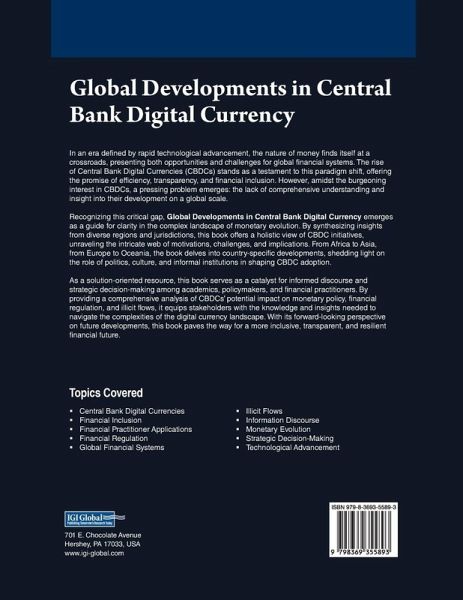 In an era defined by rapid technological advancement, the nature of money finds itself at a crossroads, presenting both opportunities and challenges for global financial systems. The rise of Central Bank Digital Currencies (CBDCs) stands as a testament to this paradigm shift, offering the promise of efficiency, transparency, and financial inclusion. However, amidst the burgeoning interest in CBDCs, a pressing problem emerges: the lack of comprehensive understanding and insight into their development on a global scale. Recognizing this critical gap, Global Developments in Central Bank Digital Currency emerges as a guide for clarity in the complex landscape of monetary evolution. By synthesizing insights from diverse regions and jurisdictions, this book offers a holistic view of CBDC initiatives, unraveling the intricate web of motivations, challenges, and implications. From Africa to Asia, from Europe to Oceania, the book delves into country-specific developments, shedding light on the role of politics, culture, and informal institutions in shaping CBDC adoption.