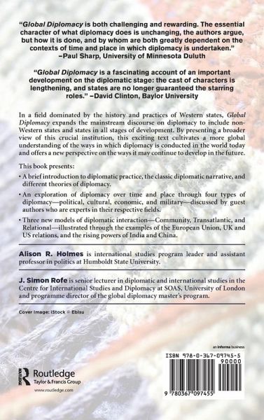 In a field dominated by the history and practices of Western states, Global Diplomacy expands the mainstream discourse on diplomacy to include non-Western states and states in all stages of development. By presenting a broader view of this crucial institution, this exciting text cultivates a more global understanding of the ways in which diplomacy is conducted in the world today and offers a new perspective on the ways it may continue to develop in the future.This book presents; a brief introduction to diplomatic practice, the classic diplomatic narrative, and different theories of diplomacy; an exploration of diplomacy over time and place through four types of diplomacy-political, cultural, economic, and military-discussed by guest authors who are experts in their respective fields; three new models of diplomatic interaction-Community, Transatlantic, and Relational-illustrated through the examples of the European Union, UK and US relations, and the rising powers of India and China.