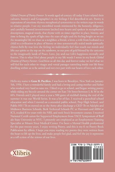 Global Dream of Poetry Forever is a collection of words and ages of century till today. I have related their cultures, histories, and geographies to my feelings I feel are described in art. Poetry is expressions of emotions, rhymes, and metaphorical symmetries to the writer's expo in words relative to people. I see my resembled words ministered by the honesty, diligence, and carefully boosted inventiveness latched into hearts and spoken in metaphorical descriptions and magical words that rhyme with times together in place, history, and time to bring the spark of light into the stars of sight and the bright feeling so we see the meaningful life we share as a neighbor, a friend, a lover, a wife from husband to a child to a civilization in place of history or time symmetrically sealed inside spiritually chiming bells by true love. It's the feeling we individually feel that touch our minds and lifts our spirits to the top of the rainbows, to our pots of gold blessed by the unicorns, to the imaginarily lands of peace, love, joy, and our life's happiness eternally and forever. This is what I feel about people in my life and words I wrote in my book, Global Dreams of Poetry Forever. God bless us all on this day and forever. Today we feel what we will feel for each other in visages and venial passages tunneling inside our life force dwelling within us to be united and not ever part with our hearts of love for each other.