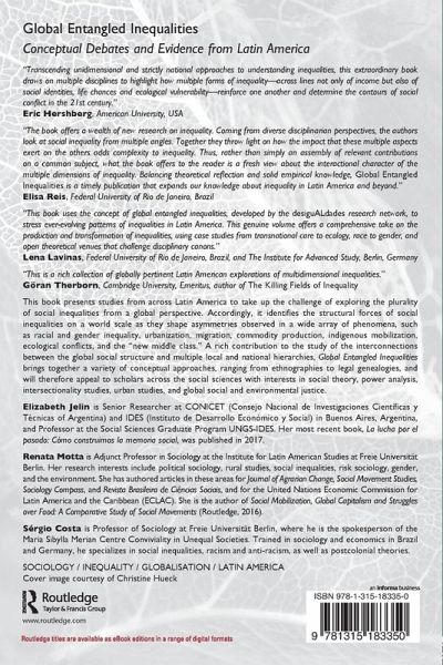 Introduction (Renata Motta, Elizabeth Jelin, and Sérgio Costa) Part I Structuring Inequalities 1. Inequality: Towards a World-Historical Perspective (Roberto Patricio Korzeniewicz) 2. Transregional Articulations of Law and Race in Latin America: A Legal Genealogy of Inequality (Manuel Góngora-Mera) 3. The Urban Space and the (Re)production of Social Inequalities: Decoupling Income Distribution and Patterns of Urbanization in Latin American Cities (Ramiro Segura) 4. Researching Inequalities from a Socio-ecological Perspective (Kristina Dietz) Part II Categorization: The Construction and Deconstruction of Persistent Hierarchies 5. The Social Imaginary of Inequalities in Latin America: Is Another View Necessary? (Juan Pablo Pérez Saínz) 6. Unequal Differences: Gender, Ethnicity/Race and Citizenship in Class Societies (Historical Realities, Analytical Approaches) (Elizabeth Jelin) 7. Competing Indigeneities: Being a (Hyper)real Ecowarrior in Twenty-first Century Bolivia (Andrew Canessa) 8. The Symbolic Construction of Inequalities (Luis Reygadas) Part III Dynamics of Production and Transformation of Inequalities 9. Multiple Layers of Inequalities and Intersectionality (Jairo Baquero-Melo) 10. Millionaires, the Established, the Outsiders, and the Poor. Social Structure and Political Crisis in Brazil (Sérgio Costa) 11. Transnational Care Chains and Entangled Inequalities (Anna Katharina Skornia) 12. Socio-Environmental Inequalities and GM crops: Class, Gender and Knowledge (Renata Motta) Final Reflections (Sérgio Costa, Elizabeth Jelin, Renata Motta) Index