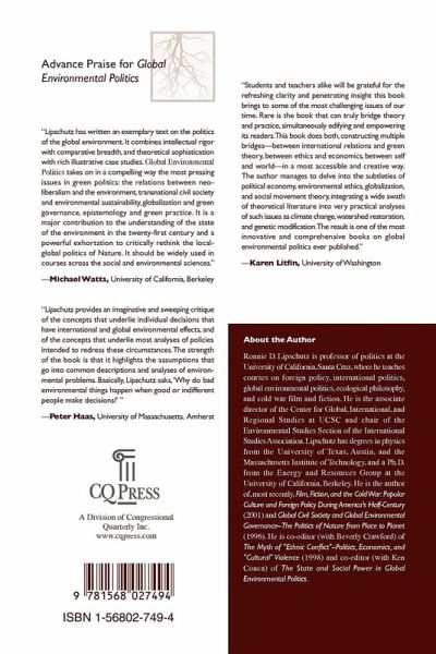Traditional views of global environmental politics take the structures and relations of international politics as a given. Solutions to environmental problems, then, must be products of concession, negotiation, and inevitable compromise&BAD:mdash;a world of top-down planetary management. Lipschutz challenges students to question these conventional approaches. He argues that much light can be shed on global environmental degradation if we look beyond the politics of conflict and cooperation and explore environmental problems from their very &BAD:quot;roots.&BAD:quot;Using a framework that accounts for the ontologies, material conditions, and power relations that structure global environmental problems, Lipschutz is able to more effectively question attempts to clean up the globe and sustain the world's natural resources. Throughout the text, the author uses compelling cases to illustrate the effects of globalization and capitalism, yet is careful to make the link between the local and the global to show how we, as individuals, are both consumers of goods and producers of pollution.A powerful new approachHow is the financing of a water system in Bolivia linked to long-standing forestation practices in India?Taking nothing for granted, the root causes of major global environmental problems are exposed and subjected to rigorous analysis. Lipschutz shows, for instance, how privatization operates in different global contexts with strikingly similar consequences.In what ways are liberalism and realism actually two sides of the same coin?Both make self-interest&BAD:mdash;of the individual and of the state&BAD:mdash;key operating terms. In a revealing comparison, Lipschutz explores the limits of these dominant political models to effectively frame and solve environmental problems.What kinds of political, social, and environmental practices bring about meaningful change?By emphasizing the global impacts of local actions, the text shows how attempts to control environmental problems may actually reproduce the very systems they are meant to ameliorate.Combined with practical pedagogyRich historical background helps contextualize contemporary issues.Extensive suggested reading lists at the end of each chapter guide students to further research, while tables and figures elegantly show data and concepts.The emphasis on assessing the root causes of global environmental problems and models encourages critical thinking. Students are also encouraged to rethink their own role in the global environmental system and to get involved in effective forms of social change.