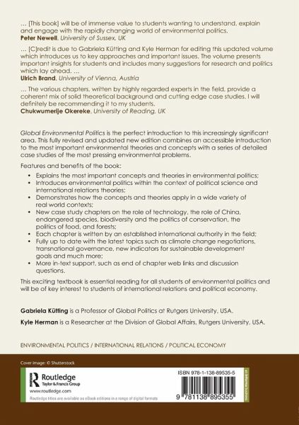 "The pressure on the global environment is still alarming and global environmental politics remains an extremely dynamic and contested field. Therefore, credit is due to Gabriela Kütting and Kyle Herman for editing this updated volume which introduces us to key approaches and important issues. The volume presents important insights for students and includes many suggestions for research and politics which lay ahead. Further, it shows convincingly that justice plays an increasingly important role in global environmental policy making." - Ulrich Brand, University of Vienna, Austria.