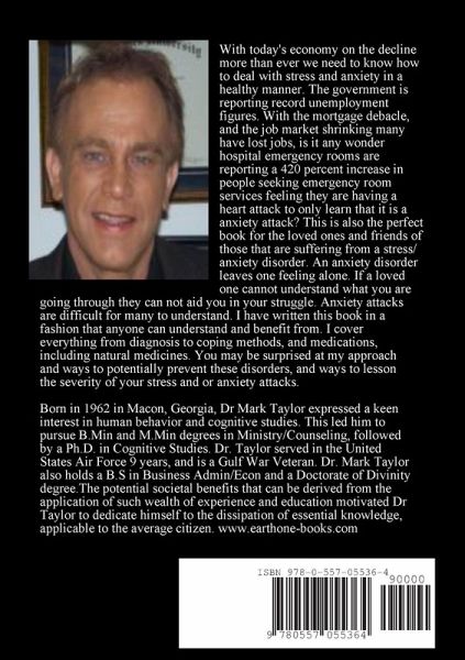 With today's economy on the decline more than ever we need to know how to deal with stress and anxiety in a healthy manner. The government is reporting record unemployment figures. With the mortgage debacle, and the job market shrinking many have lost jobs, is it any wonder hospital emergency rooms are reporting a 420 percent increase in people seeking emergency room services feeling they are having a heart attack to only learn that it is an anxiety attack? This is also the perfect book for the loved ones and friends of those that are suffering from a stress/anxiety disorder. An anxiety disorder leaves one feeling alone. If a loved one cannot understand what you are going through they can not aid you in your struggle. Anxiety attacks are difficult for many to understand. I have written this book in a fashion that anyone can understand and benefit from. I cover everything from diagnosis to coping methods, and medications, including natural medicines.