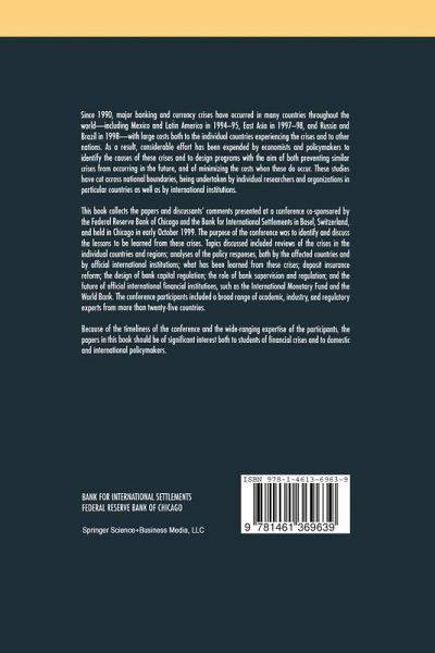 This book collects the papers and discussants' comments presented at a conference co-sponsored by the Federal Reserve Bank of Chicago and the Bank for International Settlements in Basel, Switzerland, and held in Chicago, in early October 1999. The purpose of the conference was to identify and discuss the lessons to be learned from these crises. Topics discussed included reviews of the crises in the individual countries and regions; analyses of the policy responses, both by the affected countries and by official international institutions; what has been learned from these crises; deposit insurance reform; the design of bank capital regulation; the role of bank supervision and regulation; and the future of official international financial institutions, such as the International Monetary Fund and the World Bank. The conference participants included a broad range of academic, industry, and regulatory experts from more than twenty-five countries.