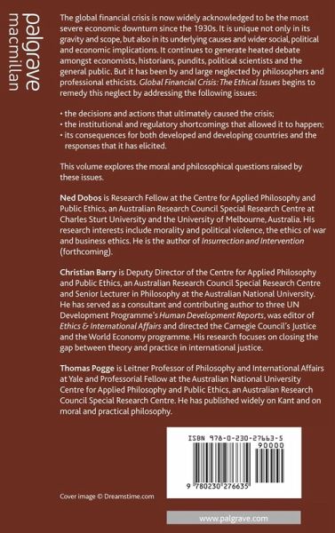 The Global Financial Crisis is acknowledged to be the most severe economic downturn since the 1930s, and one that is unique in its underlying causes, its scope, and its wider social, political and economic implications. This volume explores some of the ethical issues that it has raised.