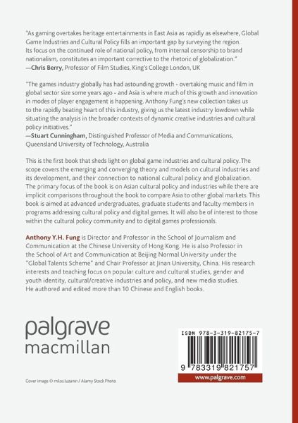 Introduction (Anthony Fung).- Session I. Creative Industries and Cultural Policy.- Chapter 1. Creative industry and Cultural Policy in Asia reconsidered (Anthony Fung).- Chapter 2. Creative industries and Cool Japan (Koichi Iwabuchi).- Chapter 3. Before the gold rush: Culture without industry in China (Michael Keane).- Session II. Regional Game Industries.- Chapter 4. Globalizing Chinese Online Game Industry: From Incubation, Hybridization to Structural Expansion in the Past Two Decades (Carlos K. F. Cheung and Anthony Fung).- Chapter 5. The Role of Dual Institutional- And Technological Entrepreneurship in The Formation of the Japanese Social Game Industry (Mirko Ernkvist).- Chapter 6. Revisiting Creative Industry Models for Game Industry Development in Southeast Asia (Pei-chi Chung).- Chapter 7. The Globally Integrated Network of South Korean Online Game Industry: Introduction (Pei-chi Chung).- Chapter 8. Media Globalization in Cultural Industries on 21st Century: A Case Study of Taiwan's Online Gaming Industry (Lai Chi Chen).- Chapter 9. A Patchwork of Potential: A Survey of the European Game Industry (David Nieborg and Jeroen de Kloet).- Chapter 10. Contested Reception of the Free-To-Play Business Model in the North American Video Game Market (Matthew M. Chew).- Session III. Mobile Play.- Chapter 11. Beyond the Game of Cat and Mouse: Challenges of Discoverability and Piracy In Mobile Gaming Market (Elaine Jing Zhao).- Chapter 12. The Place of the Mobile Play: Camera Phone Play and Gamified Locative Media (Larissa Hjorth).- Session IV. Online Games.- Chapter 13. Online Game Worlds as a Virtual Co-presence across National Borders (Holin Lin and Chuen-Tsai Sun).- Chapter 14. The Decline of MMOs (Richard A. Bartle).- Chapter 15. Governance Challenges in the Global Games Industry (Darryl Woodford).- Index.