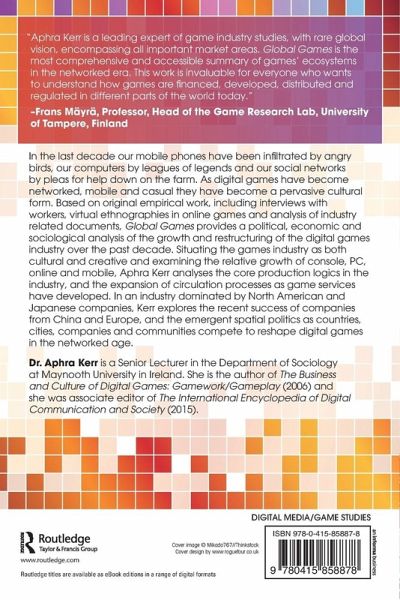 "Aphra Kerr is a leading expert of game industry studies, with rare global vision, encompassing all important market areas. Global Games is the most comprehensive and accessible summary of games' ecosystems in the networked era. This work is invaluable for everyone who wants to understand how games are financed, developed, distributed and regulated in different parts of the world today." -Frans Mäyrä, Professor, Head of the Game Research Lab, University of Tampere, Finland