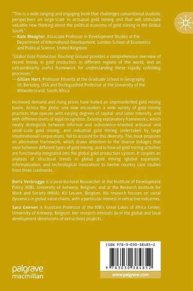 1. Introduction: Snapshots of Global Gold Mining.- PART 1: TRENDS IN GLOBAL GOLD PRODUCTION.- 2. Theorizing the Global Gold Production System.- 3. Global Expansion.- 4. Informalization.- 5. Technological Innovation.- PART 2: GLOBAL GOLD PRODUCTION TOUCHING GROUND.- 6. Brazil: Garimpagem, Forever Informal.- 7. Peru: Curtailing Smuggling, Regionalizing Trade.- 8. Colombia: Legal Loopholes behind Illegal Gold Trade.- 9. Ghana: A History of Expansion and Contraction in Gold Mining.- 10. Ghana: Controversy, Criminalization and Chinese Miners.- 11. Burkina Faso: Global Gold Expansion and Local Terrains.- 12. Uganda: Gold as a (Trans)National Treasure.- 13. Guinea-Conakry and Burkina Faso: Innovations at the Periphery.- 14. The DRC: From Stones in the River to Diving for Dollars.- 15. Zimbabwe: A Gold Mining Boom amidst rapid Agrarian Change.- 16. Madagascar: Emergence and Persistence on the Hundred-Year Frontier.- 17. Indonesia: Adaptation and Differentiation in Informal Gold Mining.- 18. The Philippines: State-Sanctioned Informalization.- 19. Conclusion.