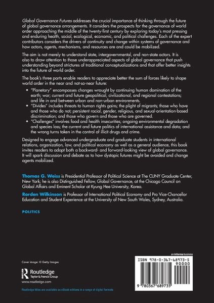 Global Governance Futures addresses the crucial importance of thinking through the future of global governance arrangements. It considers the prospects for the governance of world order approaching the middle of the twenty-first century by exploring today's most pressing and enduring health, social, ecological, economic, and political challenges. Each of the expert contributors considers the drivers of continuity and change within systems of governance and how actors, agents, mechanisms, and resources are and could be mobilized.