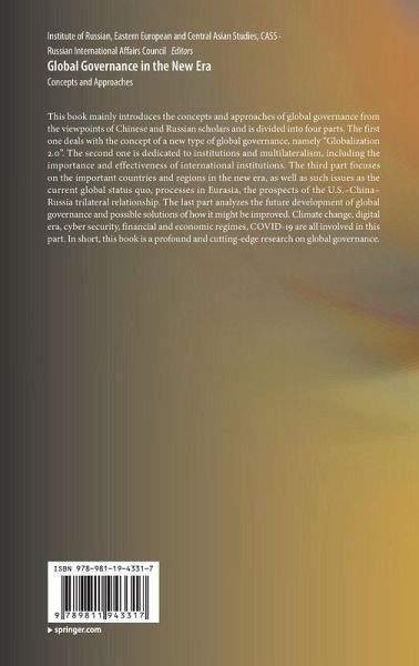 This book mainly introduces the concepts and approaches of global governance from the viewpoints of Chinese and Russian scholars and is divided into four parts. The first one deals with the concept of a new type of global governance, namely "Globalization 2.0". The second one is dedicated to institutions and multilateralism, including the importance and effectiveness of international institutions. The third part focuses on the important countries and regions in the new era, as well as such issues as the current global status quo, processes in Eurasia, the prospects of the U.S. - China - Russia trilateral relationship. The last part analyzes the future development of global governance and possible solutions of how it might be improved. Climate change, digital era, cyber security, financial and economic regimes, COVID-19 are all involved in this part. In short, this book is a profound and cutting-edge research on global governance.