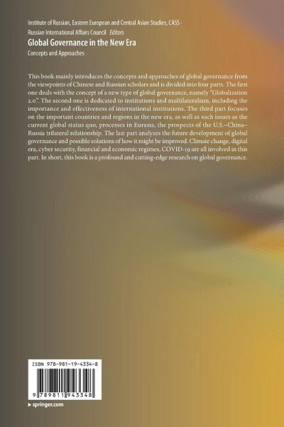 This book mainly introduces the concepts and approaches of global governance from the viewpoints of Chinese and Russian scholars and is divided into four parts. The first one deals with the concept of a new type of global governance, namely "Globalization 2.0". The second one is dedicated to institutions and multilateralism, including the importance and effectiveness of international institutions. The third part focuses on the important countries and regions in the new era, as well as such issues as the current global status quo, processes in Eurasia, the prospects of the U.S. - China - Russia trilateral relationship. The last part analyzes the future development of global governance and possible solutions of how it might be improved. Climate change, digital era, cyber security, financial and economic regimes, COVID-19 are all involved in this part. In short, this book is a profound and cutting-edge research on global governance.