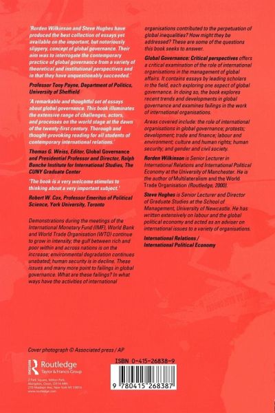 Foreword Craig N. Murphy List of figures, Tables and Boxes List of abbreviations About the Contributions Acknowledgements 1. Global Governance: a preliminary interrogation Rorden Wilkinson Global Financial and Development Governance 2. Reforming the International Financial Architecture: the new political agenda Randall D. Germain 3. The Mother of all Governments: the World Bank's Matrix for Global Governance Paul Cammack Global Environmental, Cultural and Health Governance 4. Global Environmental Governance Lorraine Elliott 5. Global Governance, Human Rights and the 'Problem' of Culture Stephanie Lawson 6. Global Health and Governance: a conceptual review Richard Dodgson and Kelly LeeHuman Security and Global Governance 7. Global Governance and Human Security Caroline Thomas 8. Global Governance and Poverty Reduction: the case of microcredit Heloise WeberOrganised Labour and Global Governance 9. Coming in from the Cold: Labour, the ILO and the international Labour Standards Regime Steve Hughes 10. International Labour and its Emerging Role in Global Governance: regime fusion, social protection, regional integration and production volatility Nigel Haworth Civil Society and global Finance 11. The Contours of Courtship: the WTO and Civil Society Rorden Wilkinson 12. Lessons from Greenham Common peace camp: an alternative approach to Global Governance Lucy James Indexes Index