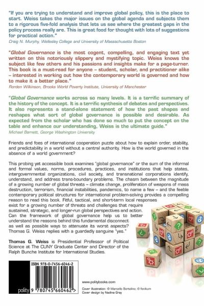This probing yet accessible book examines "global governance" or the sum of the informal and formal values, norms, procedures, and institutions that help states, intergovernmental organizations, civil society, and transnational corporations identify, understand, and address trans-boundary problems. The chasm between the magnitude of a growing number of global threats - climate change, proliferation of weapons of mass destruction, terrorism, financial instabilities, pandemics, to name a few - and the feeble contemporary political structures for international problem-solving provide compelling reasons to read this book. Fitful, tactical, and short-term local responses exist for a growing number of threats and challenges that require sustained, strategic, and longer-run global perspectives and action. Can the framework of global governance help us to better understand the reasons behind this fundamental disconnect as well as possible ways to attenuate its worst aspects? Thomas G. Weiss replies with a guardedly sanguine "yes".