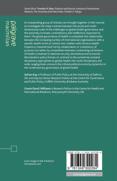 Acknowledgements Notes on Contributors Introduction: The International Political Economy of Global Health Governance; A.Kay & O.Williams PART I: THE POLITICS OF GLOBAL HEALTH GOVERNANCE Understandings of Global Health Governance: The Contested Landscape; K.Lee National Security and Global Health Governance; C.McInnes Global Governance Capacities in Health: WHO and Infectious Diseases; S.Rushton The International Political Economy of Global Responses to HIV/AIDS; A.Ingram Chronic Diseases and Global Health Governance: The Contrasting Cases of Food and Tobacco; S.Barraclough PART II: THE ECONOMY OF GLOBAL HEALTH GOVERNANCE Unpacking Economism and Remapping the Terrain of Global Health; M.Sparke The Power of Money: Global Financial Markets, National Politics, and Social Determinants of Health; T.Schrecker Trade and Health; R.Labonté, C.Blouin & L.Forman IMF Policies and Health in Sub-Saharan Africa; R.P.Buckley & J.Baker The World Bank and Health; S.Harman The Competition State and the Private Control of Health Care; H.Löfgren Index