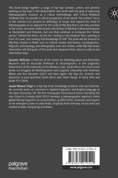 This book brings together a range of hip hop scholars, artists and activists working on Hip Hop in the Global North and South with the goal of advancing Hiphopographic research as a critical methodology with critical fieldwork methods that can provide a critical perspective of our world. The authors' focus in this volume is to present an anthology of essays that expand the remit of Hiphopography as an approach to the study of Hip Hop that is not only sensitive to the social, economic, political and cultural lives of Hip Hop Culture participants as interpreters and theorists, but one that continues to humanize the "whole person" behind the decks, on the mic, rocking on the linoleum floor, painting in front of a wall, and seeking that Knowledge of Self. This book will be relevant to Hip Hop scholars in fields such as cultural studies and history, sociolinguistics, linguistic anthropology and ethnography, and race studies, while Hip Hop heads themselves will find parts of this book that represent their culture in ethical and informative ways.