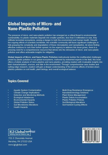 The presence of micro- and nano-plastic pollution has emerged as a critical threat to environmental sustainability. As plastic materials degrade into smaller particles, less than 5 millimeters in size, they infiltrate terrestrial ecosystems, posing a danger to both the environment and human health. Despite the ongoing efforts of scientists worldwide, the scientific community still faces significant challenges in fully grasping the complexity and degradation of these microplastics and nanoplastics, let alone finding effective solutions to curb their further spread. As the urgency to address this issue grows, there is a pressing need for a comprehensive resource that delves into the intricacies of micro- and nano-plastic pollution and offers actionable insights for mitigation. Global Impacts of Micro- and Nano-Plastic Pollution meticulously tackles the multifaceted challenges posed by plastic pollution in our global ecosystems. Authored by esteemed experts in the field, this book offers a holistic analysis of micro-plastics and nano-plastics, providing readers with invaluable insights into their characterization, sources, and fate in the environment. Through comprehensive case studies and cutting-edge research, readers will gain a deeper understanding of the adverse effects of broken-down plastics pollution on soil health, plant biology, and overall ecological balance.