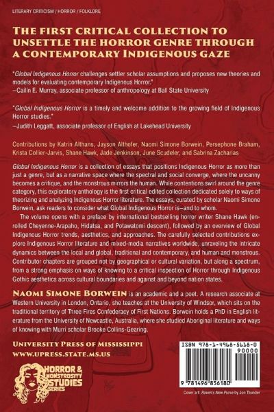 Contributions by Katrin Althans, Jayson Althofer, Naomi Simone Borwein, Persephone Braham, Krista Collier-Jarvis, Shane Hawk, Jade Jenkinson, June Scudeler, and Sabrina Zacharias Global Indigenous Horror is a collection of essays that positions Indigenous Horror as more than just a genre, but as a narrative space where the spectral and social converge, where the uncanny becomes a critique, and the monstrous mirrors the human. While contentions swirl around the genre category, this exploratory anthology is the first critical edited collection dedicated solely to ways of theorizing and analyzing Indigenous Horror literature. The essays, curated by scholar Naomi Simone Borwein, ask readers to consider what Global Indigenous Horror is--and to whom. The volume opens with a preface by international bestselling horror writer Shane Hawk (enrolled Cheyenne-Arapaho, Hidatsa, and Potawatomi descent), followed by an overview of Global Indigenous Horror trends, aesthetics, and approaches. The carefully selected contributions explore Indigenous Horror literature and mixed-media narratives worldwide, unraveling the intricate dynamics between the local and global, traditional and contemporary, and human and monstrous. Contributor chapters are grouped not by geographical or cultural variation, but along a spectrum, from a strong emphasis on ways of knowing to a critical inspection of Horror through Indigenous Gothic aesthetics across cultural boundaries and against and beyond nation states.