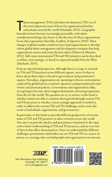 Talent management (TM) and talent development (TD) are of the most important areas of focus for organizational leaders and scholars around the world (Machado, 2015). Geographic boundaries have become increasingly permeable, with talent considerations being a key factor in the decision of where organizations locate their operations (Farndale, Scullion, & Sparrow, 2010). These changes in global market conditions have lead organizations to develop robust global talent management and development strategies that help organizations attract and retain the best talent (Nilsson & Ellström, 2012). Still, most international TM and TD initiatives can be described as ad hoc, non-strategic, or based on exported models from the West (Machado, 2015) From an operational perspective, although there is a surge in research on TM and TD practices across different regions, most of what we know about these topics is based on government and practitioners' reports. Nowadays, organizations are operating in diverse environments catalyzed by globalization, economic openness, and governmental smart visions and practical policies. Governments and organizations alike, are aspiring to become talent magnet destination, attracting expatriates from all over the world. The question we try to answer in this book is whether entities are able to continue their growth through current TM and TD practices or whether a more strategic approach is needed in order to address the current TM and TD challenges and to meet the needs of individuals, organizations, and governments. In particular, in this book we provide different perspectives of current status of TM and TD practices in select countries across the world. Our aim is to provide scholars and practitioners interested in the topic with a better understanding of TM and TD practices, and an overview of factors that affect these practices. Once we understand the different challenges, practitioners and leaders can use TM and TD as a source of power, or a strategy, that can lead people and organizations into success.