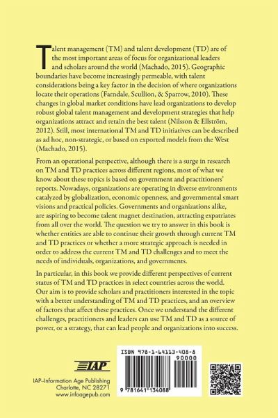 Talent management (TM) and talent development (TD) are of the most important areas of focus for organizational leaders and scholars around the world (Machado, 2015). Geographic boundaries have become increasingly permeable, with talent considerations being a key factor in the decision of where organizations locate their operations (Farndale, Scullion, & Sparrow, 2010). These changes in global market conditions have lead organizations to develop robust global talent management and development strategies that help organizations attract and retain the best talent (Nilsson & Ellström, 2012). Still, most international TM and TD initiatives can be described as ad hoc, non-strategic, or based on exported models from the West (Machado, 2015) From an operational perspective, although there is a surge in research on TM and TD practices across different regions, most of what we know about these topics is based on government and practitioners' reports. Nowadays, organizations are operating in diverse environments catalyzed by globalization, economic openness, and governmental smart visions and practical policies. Governments and organizations alike, are aspiring to become talent magnet destination, attracting expatriates from all over the world. The question we try to answer in this book is whether entities are able to continue their growth through current TM and TD practices or whether a more strategic approach is needed in order to address the current TM and TD challenges and to meet the needs of individuals, organizations, and governments. In particular, in this book we provide different perspectives of current status of TM and TD practices in select countries across the world. Our aim is to provide scholars and practitioners interested in the topic with a better understanding of TM and TD practices, and an overview of factors that affect these practices. Once we understand the different challenges, practitioners and leaders can use TM and TD as a source of power, or a strategy, that can lead people and organizations into success.