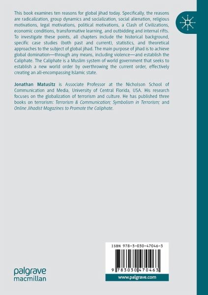 This book examines ten reasons for global jihad today. Specifically, the reasons are (1) radicalization, (2) group dynamics and socialization, (3) social alienation, (4) religious motivations, (5) legal motivations, (6) political motivations, (7) a Clash of Civilizations, (8) economic conditions, (9) transformative learning, and (10) outbidding and internal rifts. To investigate these points, all chapters include the historical background, specific case studies (both past and current), statistics, and theoretical approaches to the subject of global jihad. The main purpose of jihad is to achieve global domination-through any means, including violence-and establish the Caliphate. The Caliphate is a Muslim system of world government that seeks to establish a new world order by overthrowing the current order, effectively creating an all-encompassing Islamic state.