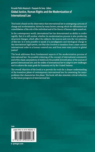 This book is based on the observation that international law is undergoing a process of change and modernization, driven by many factors, among which the affirmation and consolidation of the role of the individual and of the theory of human rights stand out. In the contemporary world, international law has demonstrated an ability to evolve rapidly. But it is still unclear whether its modernization process is also producing structural changes, which affect the subjects, the sources and even the very purpose of this law. Is it truly possible to speak of a paradigmatic and ideological change in the international legal system, one that also involves a transition from a state-centred international order to a human-centred one, and from inter-state justice to global justice?The book addresses three fundamental aspects of the modernization process of international law: the possible widening of the concept of international community and of the classic assumptions of statehood; the possible diversification of the sources of general international law; and the ability of international law to adapt to new challenges and to achieve the main goals for humanity set by the United Nations.The overall objective of the book is to provide the tools for a deeper understanding of the transition phase of contemporary international law, by examining the major problems that characterize this phase. The book will also stimulate critical reflection on the future prospects of international law.