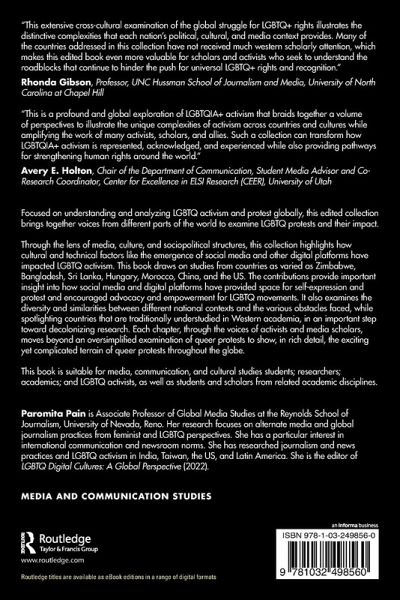 "This volume is an important collection focusing on LGBTQ protest mechanisms and advocacy from around the world. With chapters on Queer youth advocacy in China and Moroccan queerness to LGBTQ+ families in Argentina and a digital rave space founded in Toronto and more, this text brings new and critical insights about how activists are navigating these spaces through traditional and digital media." Laura Castañeda, Professor of Professional Practice, USC Annenberg School for Communication and Journalism.