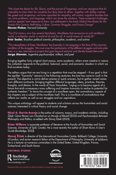 1. Introduction: Why Global Manifestos for the 21st Century? 2. Foreword: Urgently Needed: A New Manifesto for Fun and Freedom PART ONE Towards a Historical View Without Retrospective Romanticism or Future Idealization 3. Sublation and Dislocation: A False Choice 4. Emancipation Through a New Global Perspective 5. Manifesto: Commonism Now! 6. A Left of the Passage 7. Universality in the Middle: A Buddhist Post-Global Perspective 8. Manifesto in Favor of Freedom of Thought and Tolerance to Dissent 9. The Lessons of Cultural Humility: From a Struggle of Universalities to the Sublation of Existing Systems PART TWO Philosophical Footprints of the Present to Build a Here-and- Now 10. United by Touch and Breath: For a Co-ontological Revolution 11. Volcanic Lakes and Hallucinatory Vegetation: A Disaster to Think About the Future 12. Epidemic Refraction: A Critical Outlook Echoing Universal Explications Through Microcosmic Mayhem 13. reading love writing art 14. Beyond the Permanent Crisis 15. Manifesto for a New Grammar of Liberation 16. The Road to the Scaffold: The Struggle of Nicolas de Condorcet and Olympe de Gouges for Gender Equality 17. The Political Challenges of Our Century in Education PART THREE Struggle of Universalities, Towards a Global Movement 18. Crisis-Impasse, Centrality of Periphery and the Necessity of International Organization 19. Europe's Malignant Supplements, I Know. But Nevertheless... 20. Is Latin America a Reflection of the Europe Avant-garde Model? 21. "Brexit for All"!: Why the Left Should (Urgently) Rediscover the Concept of Sovereignty 22. Decolonial Feminism: A Political Proposal from the Global South 23. Universalities: The Power of Lack 24. Austerity, Brexit, Covid: Short Circuits and a New Identity for Wales 25. No More Manifestos!... Zizek Said "Europe"? 26. From Balkanized Universal(s) to Archipelagic Multiverse 27. War in the State and the State in War 28. Can Europe Be a Manifesto? The Role of Europe in Korean American Literature 29. Lapulapu's Kris and Panglima Awang's First Circumnavigation of the World PART FOUR Distinction or Difference: Letting Go of Confrontation and Starting Co-Construction 30. Where the Individual Was, the Self Must Come! 31. The Patipolitical Body 32. "This is a Shitty Government, But it is My Government": Love, Power, War in Times of "Collapsed Horizons" and History's Limitation 33. The Cosmopolitan Left Against Neoliberalism, Liberfascism and Cyberalism in the Twenty-First Century: A Latin American Approach to the Current Global Political Situation Since Post-Communism 34. Reflections from the Theory of the Encryption of Power: Energeia and the Manifestation of the Non-Being 35. The Formation of a Necro-State: Biopolitical Effects of Neoliberal Capitalism in Contemporary Ecuador 36. Real Subsumption, a Problem Rendered 37. Interiority and Exteriority in the Space of Capital 38. Epilogue: Contradictions Between Irreconcilable Manifestos
