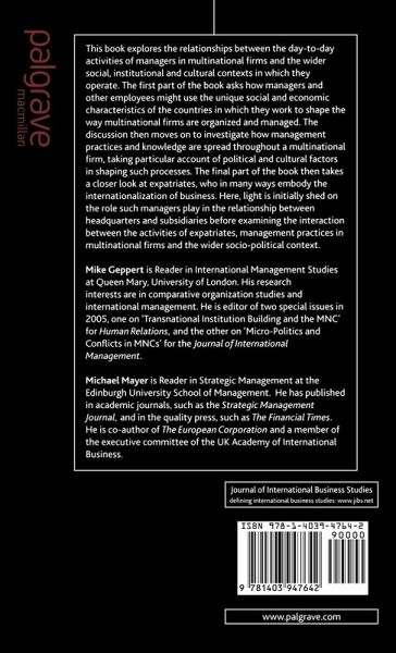 This book explores the relationships between the day-to-day activities of managers in multinational firms, and the wider social, institutional and cultural contexts in which they operate. It examines new qualitative research material and applies theoretical approaches previously unexplored in the fields of international management and business.