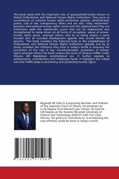 This book deals with the important role of quasi-judicial bodies known as Global Ombudsman and National Human Rights Institutions. They serve as cornerstones of national human rights protection systems, administrative justice, rule of law, transparency, ethics and are also "relay mechanism" between international human rights norms and the national level.They are institutions aside the mainstream courts that can be empowered and strengthened to clamp down on all forms of corruption, abuse of power, human rights abuse, amongst others, and by so doing ensure a more focused and all rounded development agenda that would benefit all persons. The book considers the historical basis to the establishment of Ombudsman and National Human Rights Institutions globally and by so doing considers the influence they have in today's world in ensuring the promotion of the rule of law, constitutionalism, protection of human rights amongst others.The book reviews the work of Ghana's CHRAJ under Ghana's 4th Republican constitutional era. It further assesses its achievements, contributions and challenges faced. It highlights the critical role that CHRAJ plays in promoting and protecting human rights.