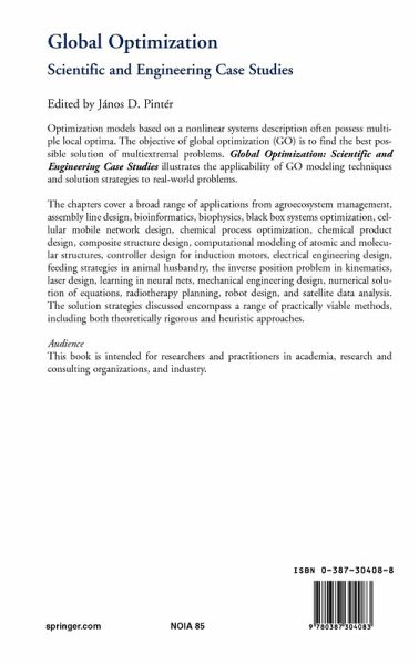 The contributed chapters cover a broad range of applications from agroecosystem management, assembly line design, bioinformatics, biophysics, black box systems optimization, cellular mobile network design, chemical process optimization, chemical product design, composite structure design, computational modeling of atomic and molecular structures, controller design for induction motors, electrical engineering design, feeding strategies in animal husbandry, the inverse position problem in kinematics, laser design, learning in neural nets, mechanical engineering design, numerical solution of equations, radiotherapy planning, robot design, and satellite data analysis. The solution strategies discussed encompass a range of practically viable methods, including both theoretically rigorous and heuristic approaches.