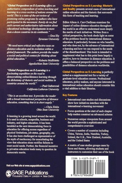 Global Perspectives on E-Learning: Rhetoric and Reality presents several cases of international online education and the rhetoric that surrounds this form of teaching and learning. Editor Alison A. Carr-Chellman examines the impact of online distance education throughout the world in an effort to understand more deeply the merits of such initiatives. Written from a critical perspective, the book sheds light on some of the problems faced by international distance educators. It particularly focuses on who benefits, and who does not, by the advance of international e-learning and how we can respond to the needs of the disenfranchised. This book is intended to supplement what has to this point been largely a positive, how-to literature in distance education. It offers a balanced perspective on the problems and possibilities of distance education worldwide.