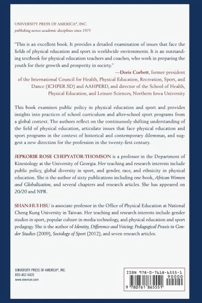 Jepkorir Rose Chepyator-Thomson is a professor in the Department of Kinesiology at the University of Georgia. Her teaching and research interests include public policy, global diversity in sport, and gender, race, and ethnicity in physical education. She is the author of sixty publications including one book, African Women and Globalization, and several chapters and research articles. She has appeared on 20/20 and NPR. Shan-Hui Hsu is associate professor in the Office of Physical Education at National Cheng Kung University in Taiwan. Her teaching and research interests include gender studies in sport, popular culture in media technology, and physical education and sport pedagogy. She is the author of Identity, Difference and Voicing: Pedagogical Praxis in Gender Studies (2009), Sociology of Sport (2012), and seven research articles.