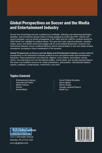 Soccer has increasingly become a political tool worldwide, reflecting and influencing ideologies, identities, and movements despite claims of being apolitical by bodies like FIFA. Historic and recent examples, such as fascist propaganda in the 1930s and the LGBTQ+ protests during the 2022 World Cup, highlight its political impact. The sport also fuels cultural production, inspiring media, music, and artistic works that engage with its socio-political dimensions. However, the intersection between soccer's political influence and its representation in arts and media remains unexplored, prompting a closer examination of this dynamic. Global Perspectives on Soccer and the Media and Entertainment Industry provides different perspectives on the interactions between political soccer and global media and entertainment industries. These perspectives are historical, religious, socio-cultural, and political, among others. Covering topics such as international politics, social media, and visually impaired players, this book is an excellent resource for media practitioners, policymakers, international relations experts, politicians, academicians, researchers, and more.