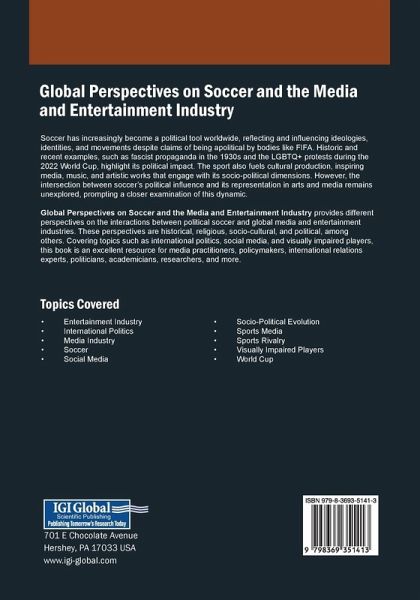 Soccer has increasingly become a political tool worldwide, reflecting and influencing ideologies, identities, and movements despite claims of being apolitical by bodies like FIFA. Historic and recent examples, such as fascist propaganda in the 1930s and the LGBTQ+ protests during the 2022 World Cup, highlight its political impact. The sport also fuels cultural production, inspiring media, music, and artistic works that engage with its socio-political dimensions. However, the intersection between soccer's political influence and its representation in arts and media remains unexplored, prompting a closer examination of this dynamic. Global Perspectives on Soccer and the Media and Entertainment Industry provides different perspectives on the interactions between political soccer and global media and entertainment industries. These perspectives are historical, religious, socio-cultural, and political, among others. Covering topics such as international politics, social media, and visually impaired players, this book is an excellent resource for media practitioners, policymakers, international relations experts, politicians, academicians, researchers, and more.